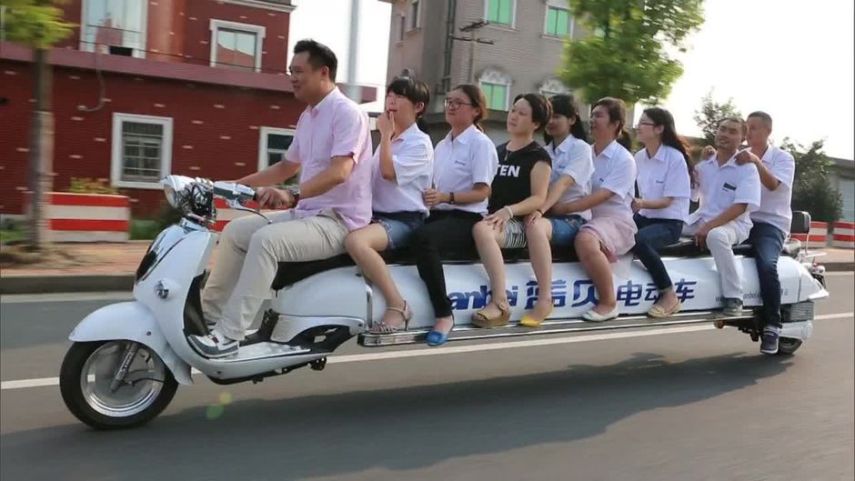 Bis zu elf Personen können auf diesem Stretch-Limo-Scooter Platz nehmen. Doch wer baut so etwas? Und wie kann das Ding überhaupt um die Kurven fahren?