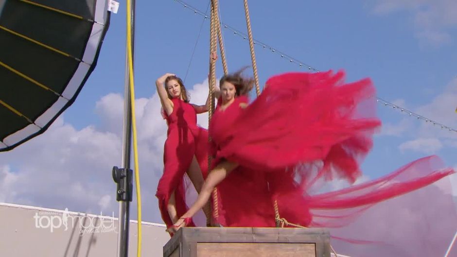 Carina lässt in der Höhe des Hang Loose Shootings alle Ängste fallen und springt auf der Box herum, um das perfekte Foto für sich zu erkämpfen! Sogar Heidi zeigt Begeisterung und kann sich nicht zurückhalten: "Oh mein Gott!"