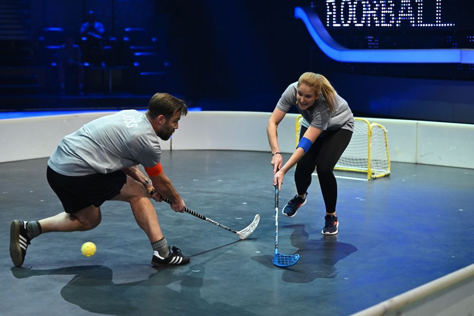 Da ist viel Action auf dem Spielfeld. Beim Floorball geht es ganz schön zur Sache: Kandidaten Judith und Joss schenken sich nichts.(P)