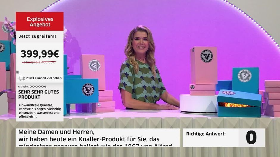 Diese Woche entführen uns die Halbfinalist:innen Anke Engelke und Joko in die wunderbare Welt des Teleshoppings. Dort wartet auf sie ein Promptertext mit ordentlichen Wissenslücken, die es zu füllen gilt. Nur der Sieger darf ins Finale und dort auf Mark Forsters Show hoffen.